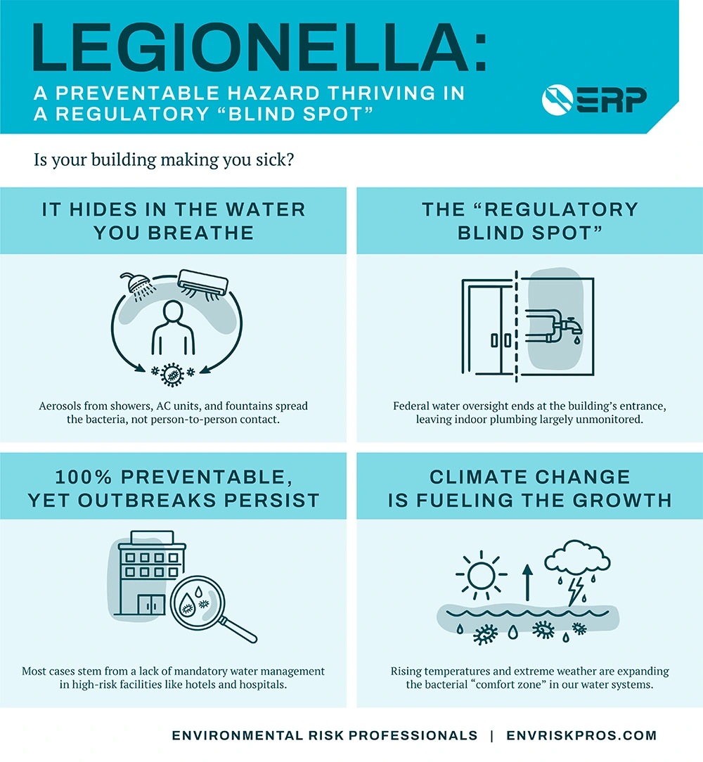 The CDC has been clear for years: most outbreaks are preventable with proper water management and consistent maintenance of at-risk systems. CDC guidance encourages building owners, especially those managing hospitals, nursing homes, hotels, and large residential complexes, to implement water management programs that monitor temperature, disinfectant levels, and stagnation (CDC, Developing a Water Management Program). But encouragement does not equal requirement. Outside of a handful of states, there are no enforceable mandates that say you must actively manage your building’s water system to prevent and monitor for Legionella. As far as I can tell, there is no cut-and-dry answer as to why this is. Mandating people to spend money on testing is often a hard ask in general, and it does not help that there is currently no definitive evidence-based consensus on the ideal frequency, location, or methods for routine testing, which can make broad mandates difficult to implement. If you prefer to be proactive instead of reactive and are struggling to find information on how to do so, contact a member of Environmental Risk Professionals to request access to a Pollution Prevention Plan specifically for Legionella.