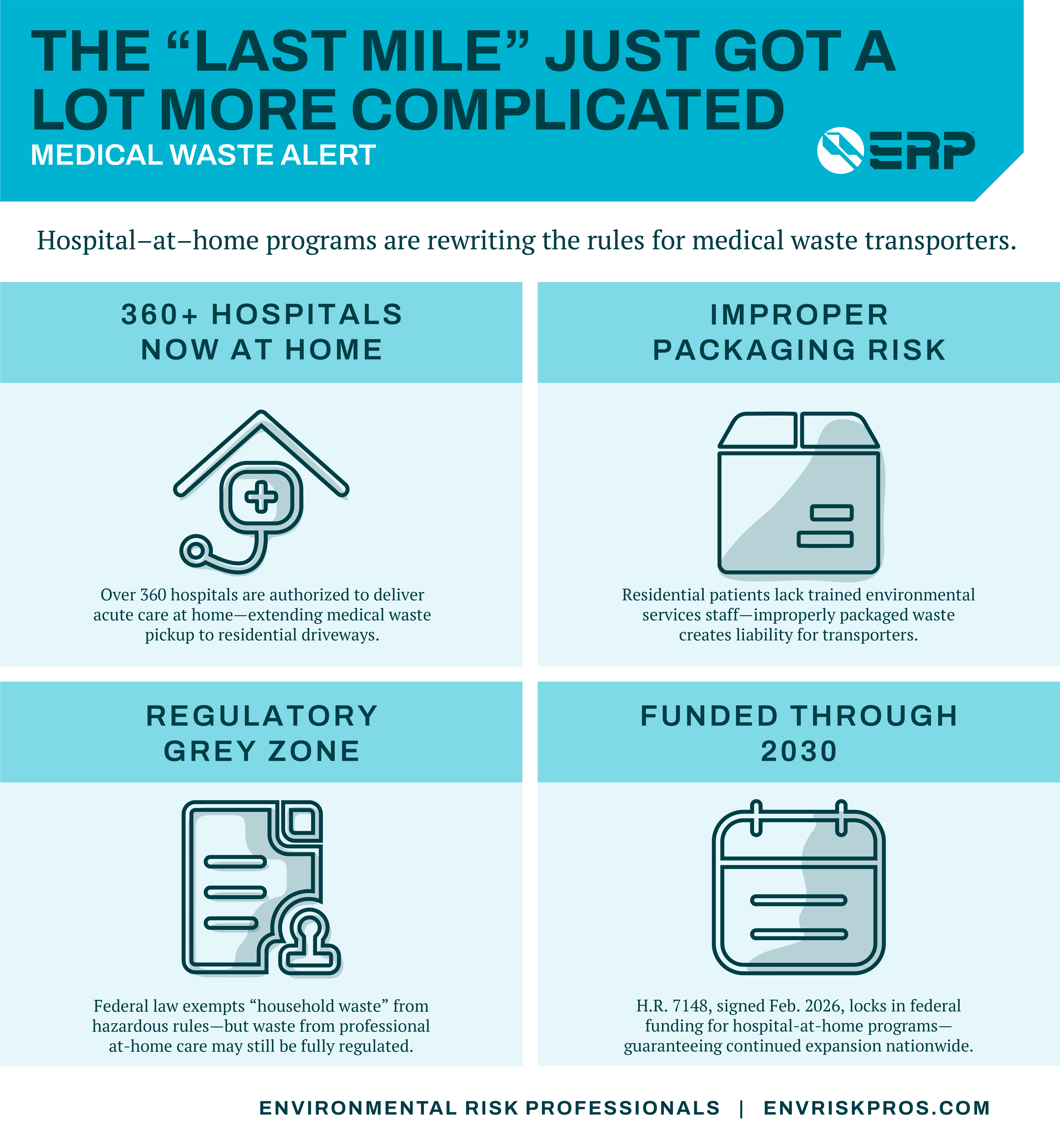 The momentum is now backed by federal law. With the signing of H.R. 7148 in February 2026, funding and regulatory support for these programs are secured through late 2030. Today, over 360 hospitals are authorized to treat acute patients at home, and that number is set to climb. While this is great for patient comfort, it creates a significant logistical challenge for those responsible for hauling away the waste. We are effectively moving the "finish line" of the medical waste process from controlled hospital loading docks to thousands of individual driveways.