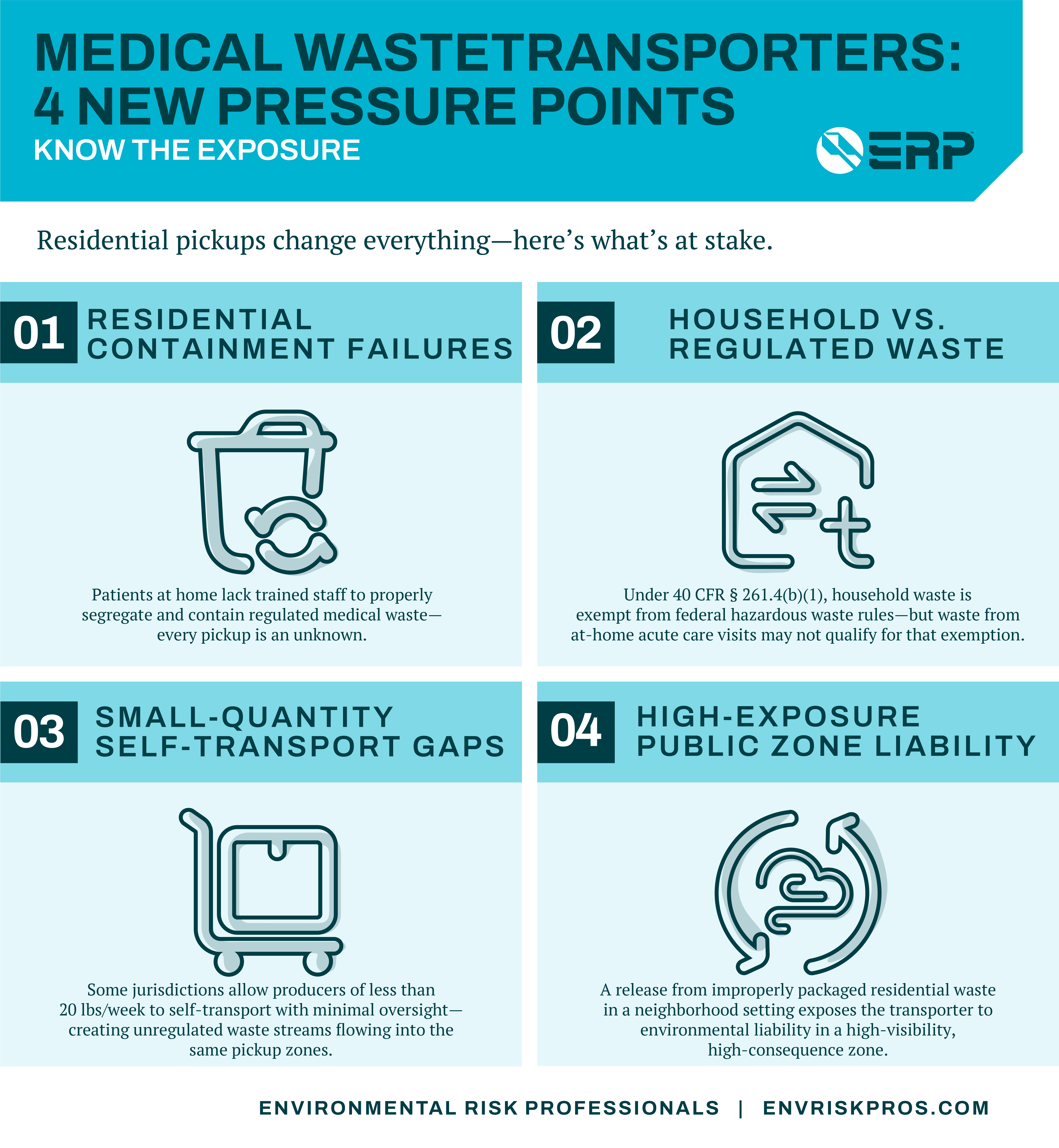 For a commercial transporter, entering a residential neighborhood is a different ballgame than servicing a medical center. If a container is packed poorly by a patient or a home-health aide, a spill doesn't happen on a concrete hospital dock, it happens in a public street or a family's driveway. This increases the potential for environmental release in high-traffic areas, leaving transport companies vulnerable to significant liability.
